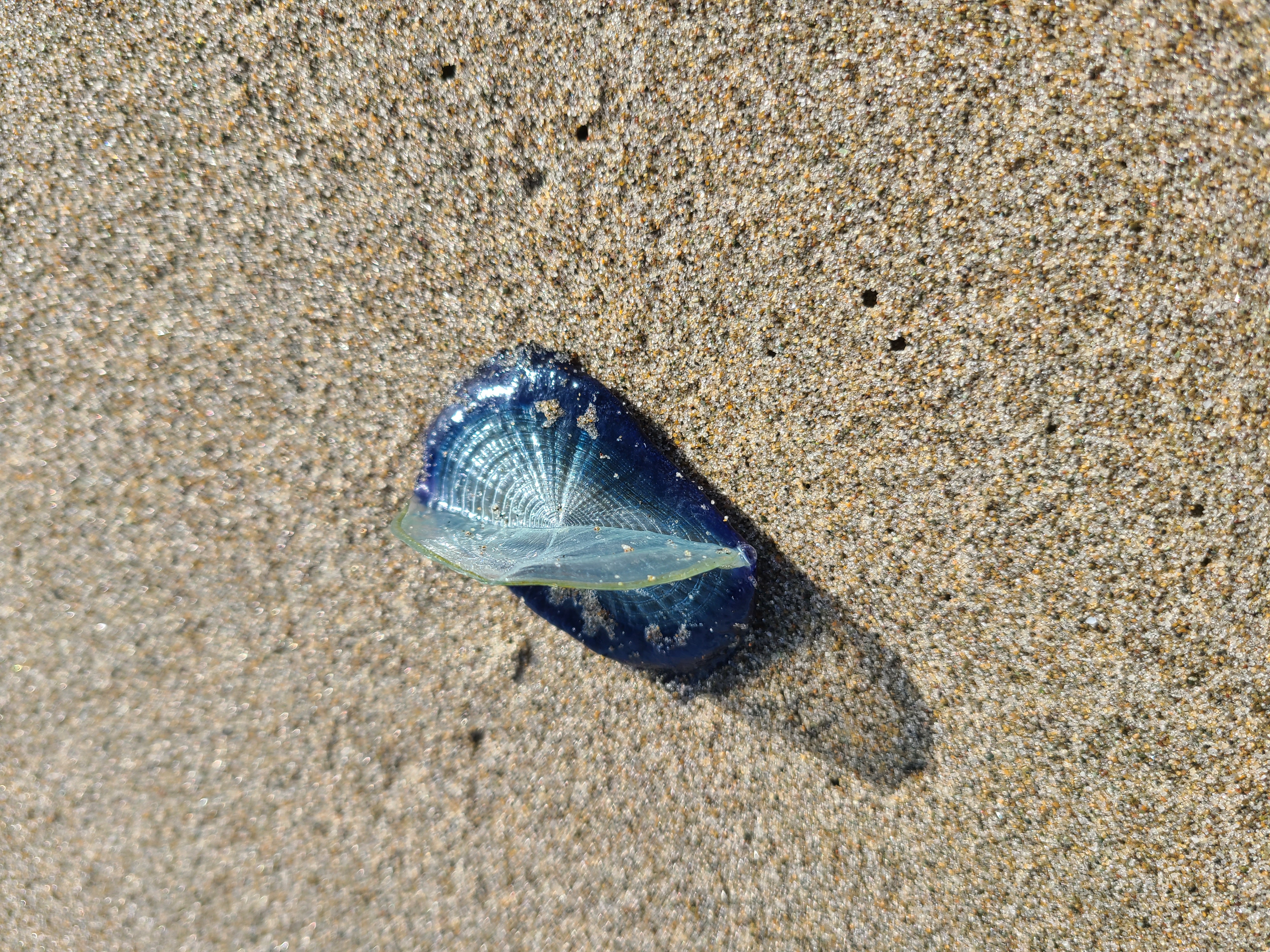 These are showing up as stretchy, three-leafed transparent disks, occasionally with a blue oval jellyfish attached, washed up on beaches at Angel Island, San Francisco.