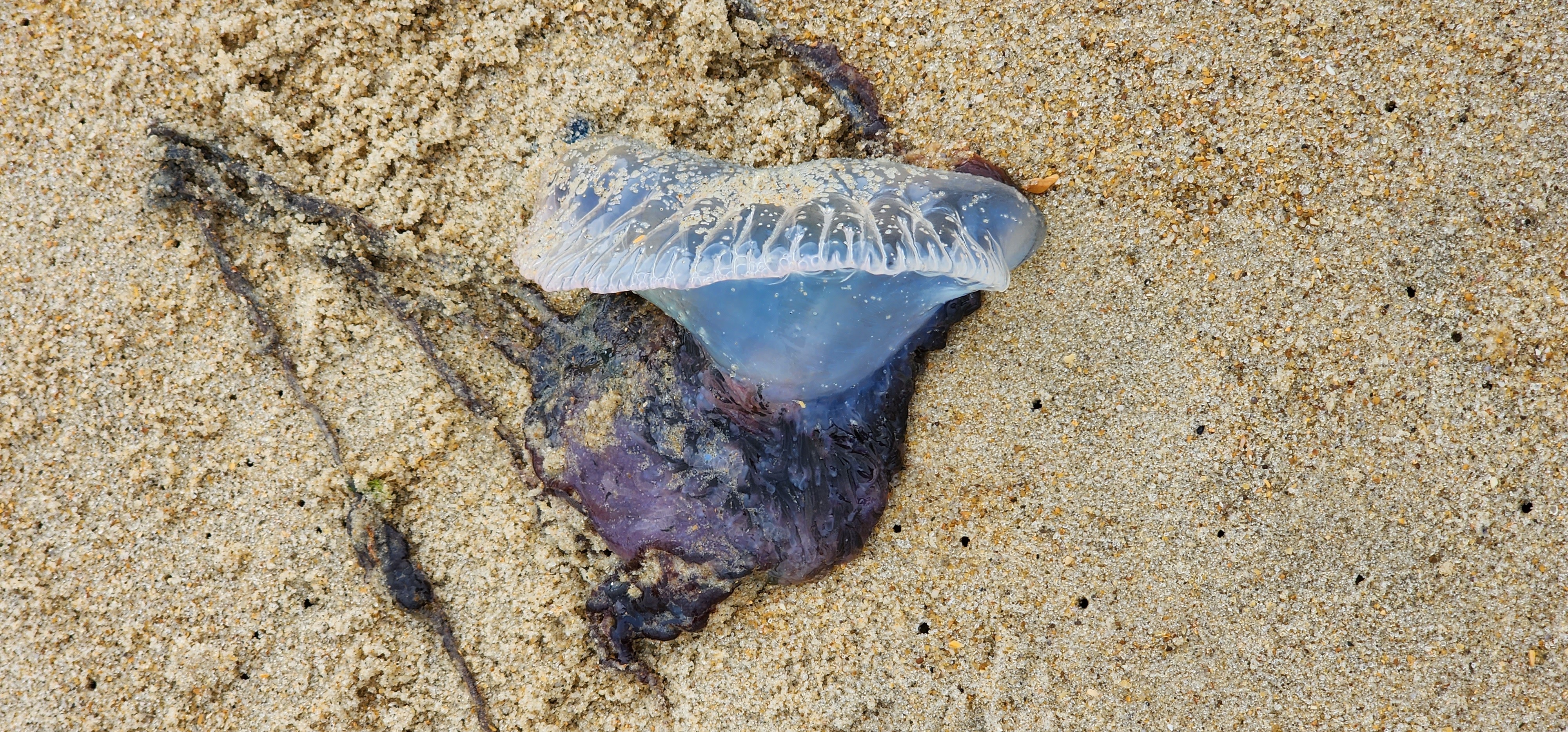 Washed up in Duck NC after storms offshore. Blue, sail, bladder. On the sand.