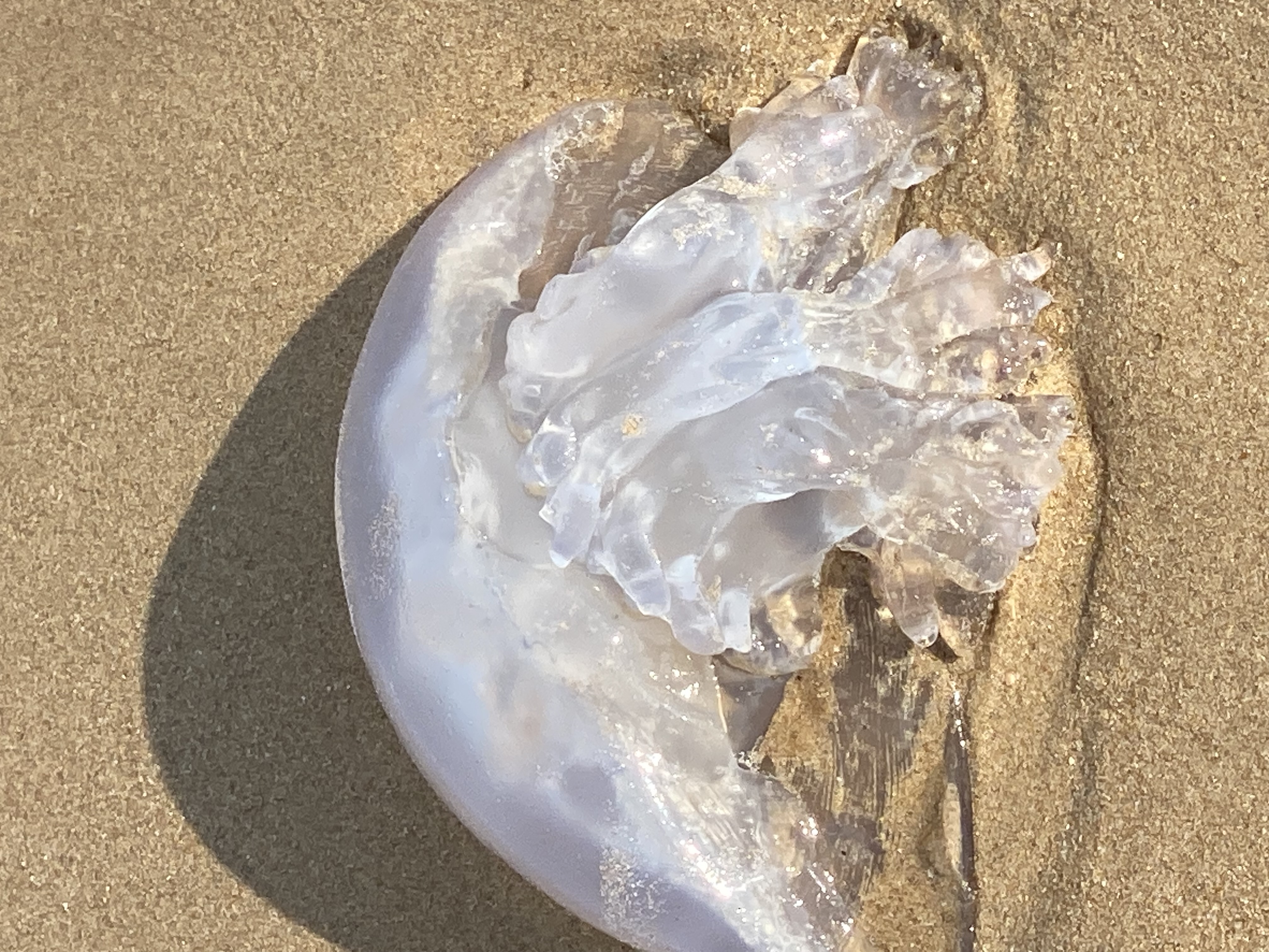 I was running along the beach around 10am and saw this very big specimen. I have no idea of what type it is but I would like to know as I am training for an Ironman and will be doing a lot of Ocean swimming in these parts. Anybody have an idea please comment. Thanks!