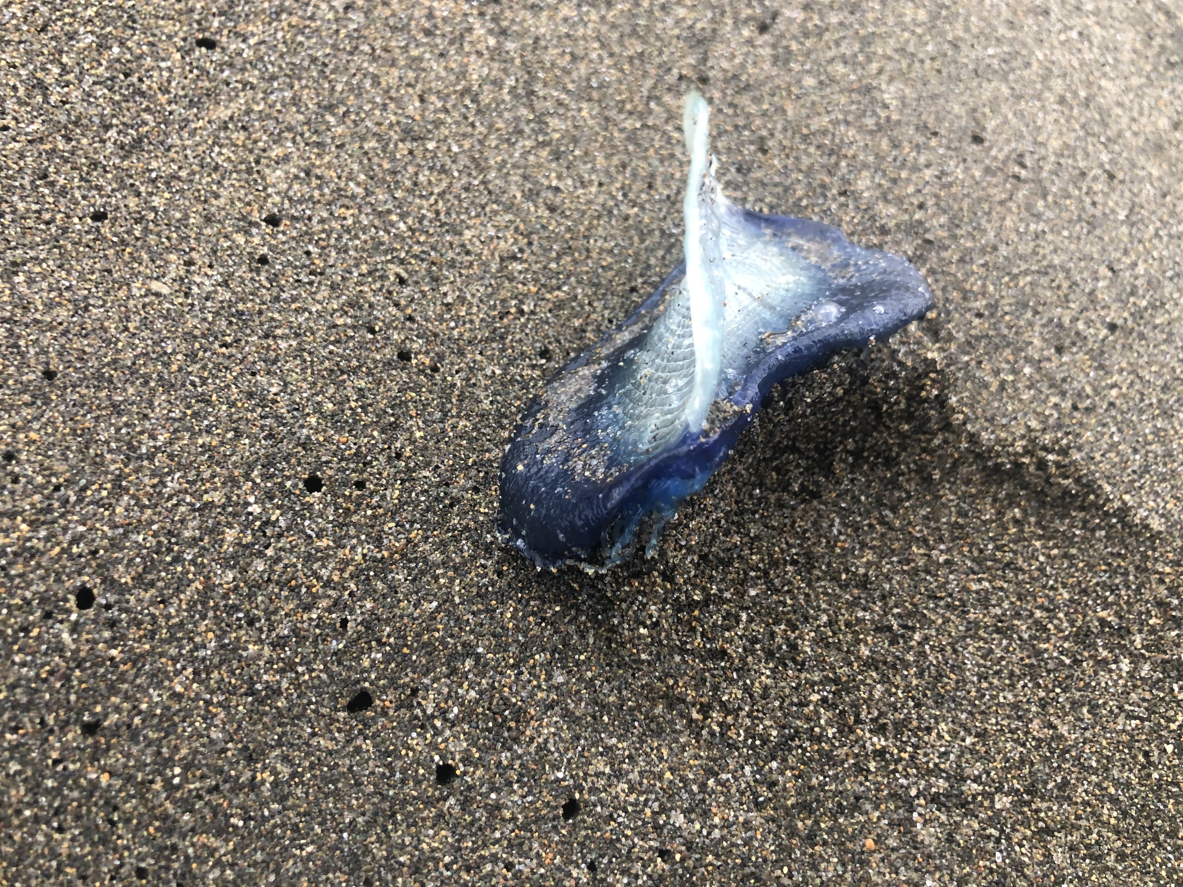 pacifica beach CA there were tons of velella (sail jellyfish) washed up on shore, did quick research and apparently it can be caused by warmer waters after winter season not 100% sure although the water temp was warmer than normal this time of year and was my first time seeing these guys. sea piggies or sand fleas were also washed up with the jellies at the shoreline not sure what caused them to wash up though. the dead velella were white-ish and would actually flake up resembling the shedded skin of a reptile while the alive beached ones were a deep purple blueish color and jelly textured body on the bottom with a clear sail like limb on top. the bottom portion of the jellyfish have a pattern on them similar to that of a seashell (ridge pattern) while being of a rounded medium sized creature.