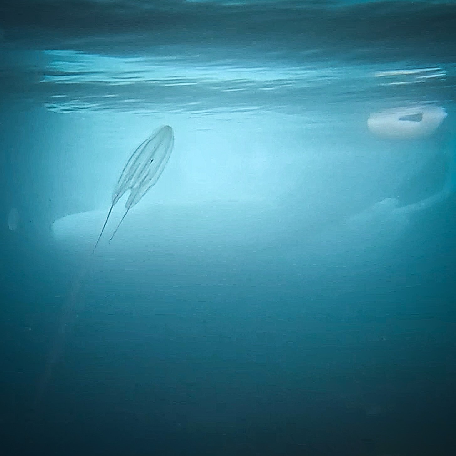 I saw three of these, two are visible in the uploaded photo, I will upload a separate photo for the other sighting. It looks very similar to beroe cucumis photos I've seen, but it has tentacles. It definitely makes me think of a gooseberry fruit. The first of the three I saw lighting up in various colors: red, green, purple and orange, if my memory is accurate.
