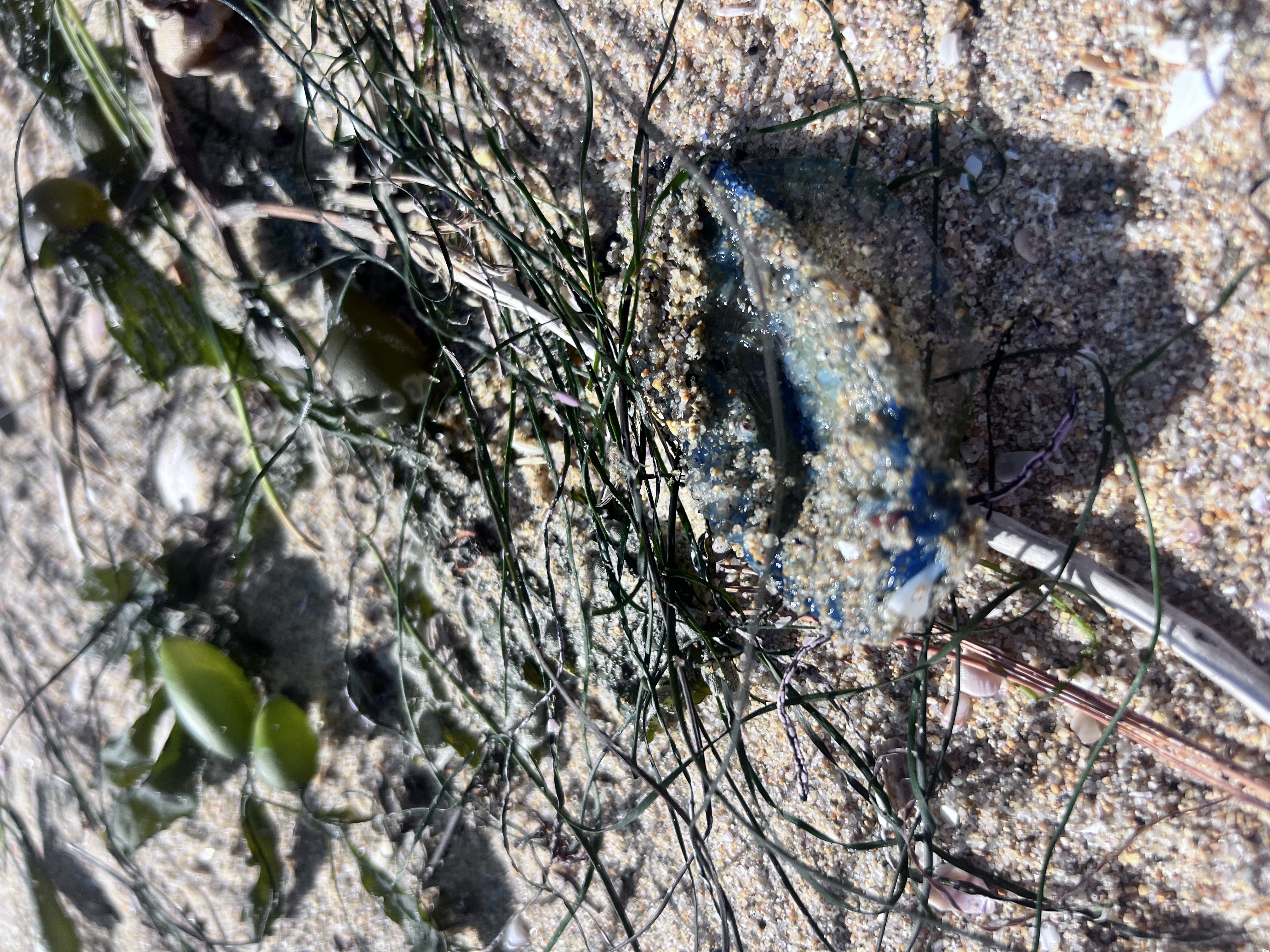 Clear blue, circular shaped, with what looks like a suction in the center, washed up on the shore, near the pier in Balboa, Newport Beach, California