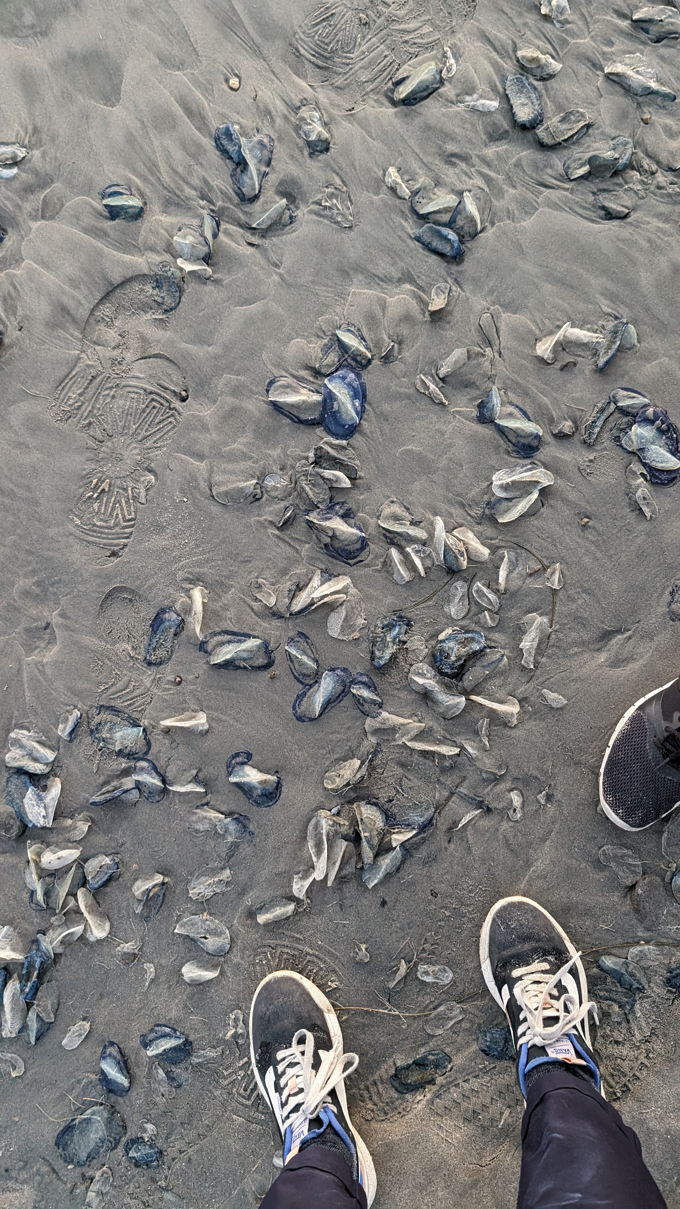 A lot of translucent velella velella near Oceanside CA municipal Pier.