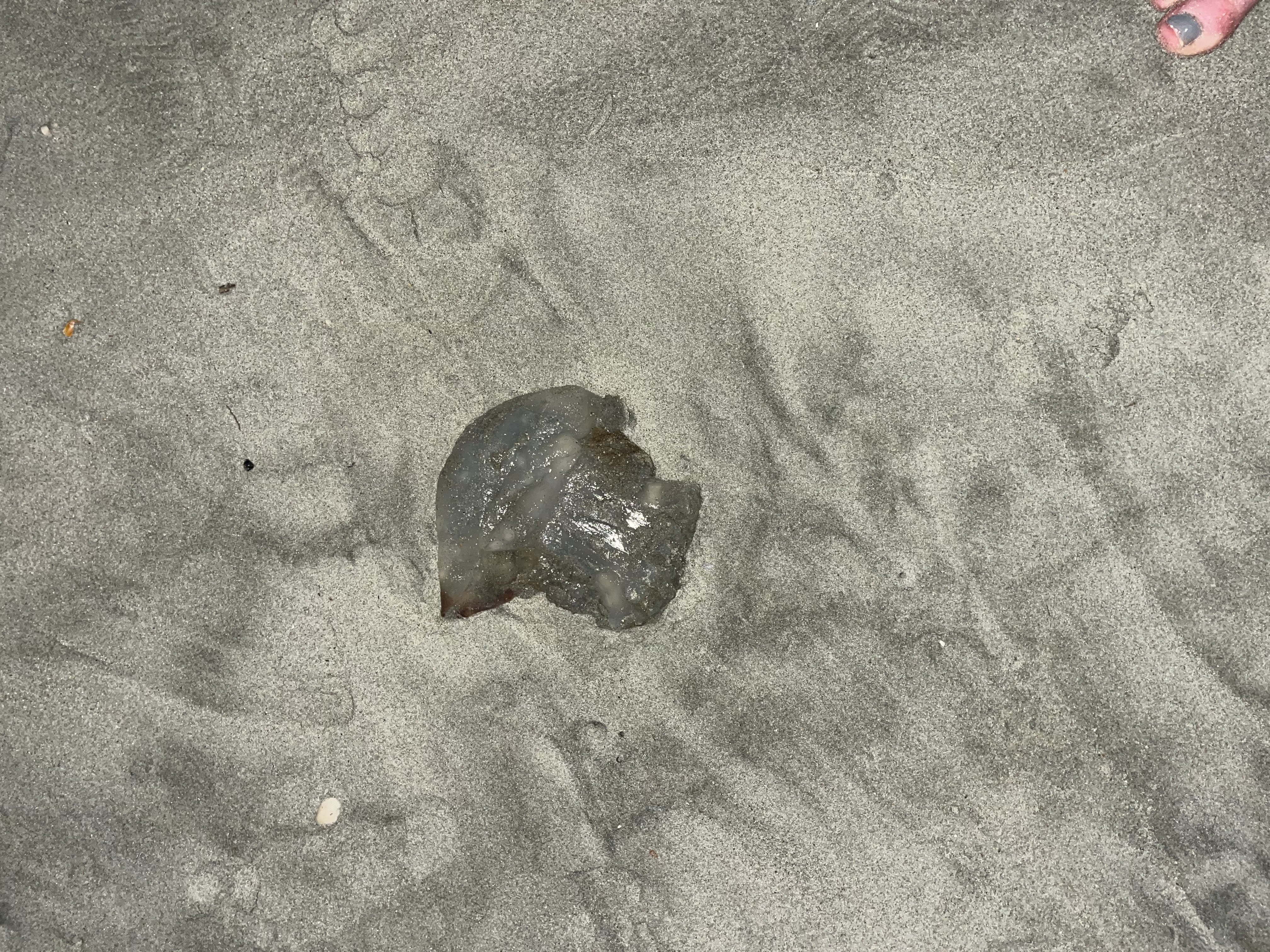 Washed up on shore dead. Has some red markings on the head. Could possibly be a man o war.