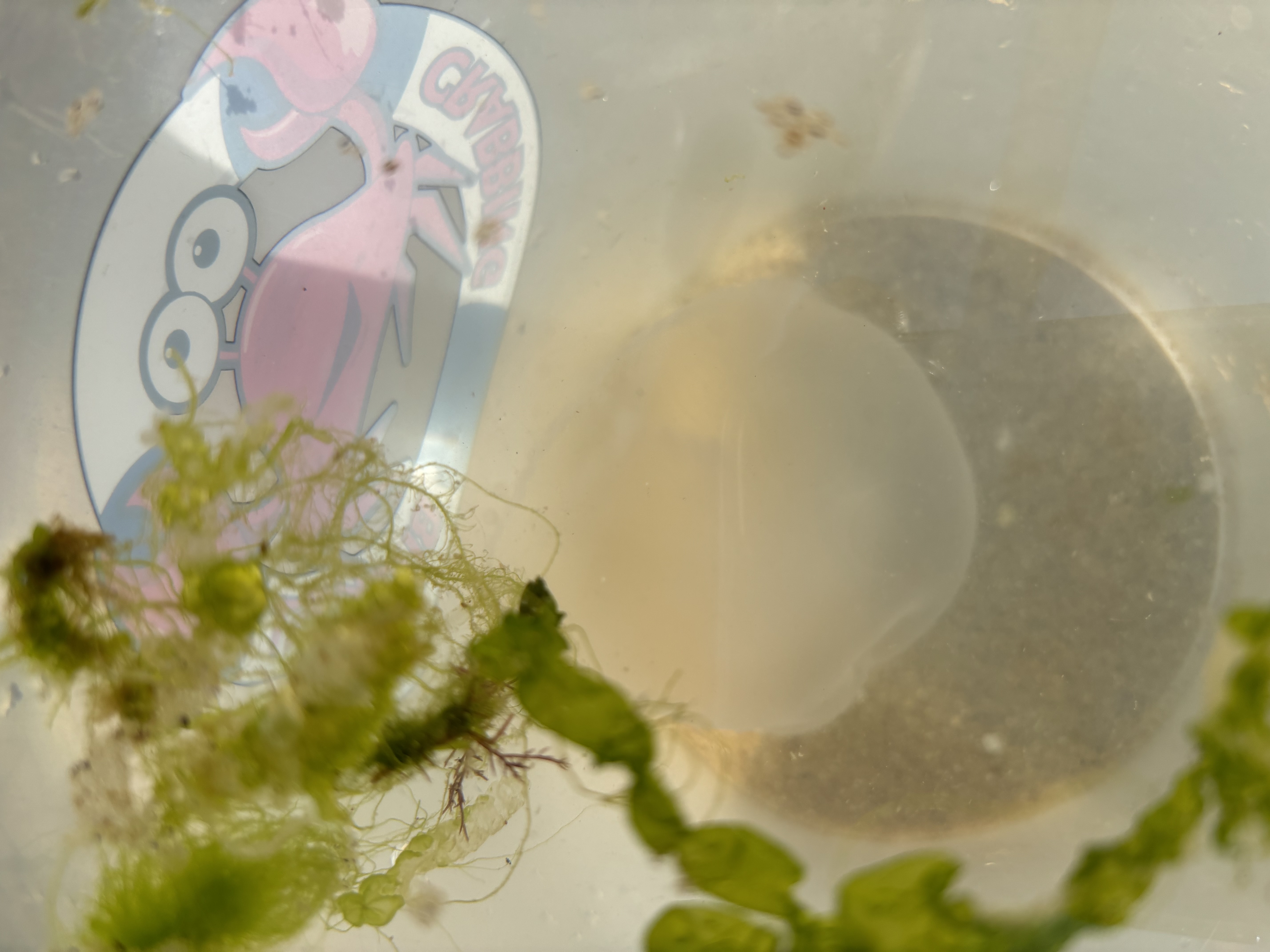 Clear, tennis ball sized, frilly tentacles , two dimples on the dome