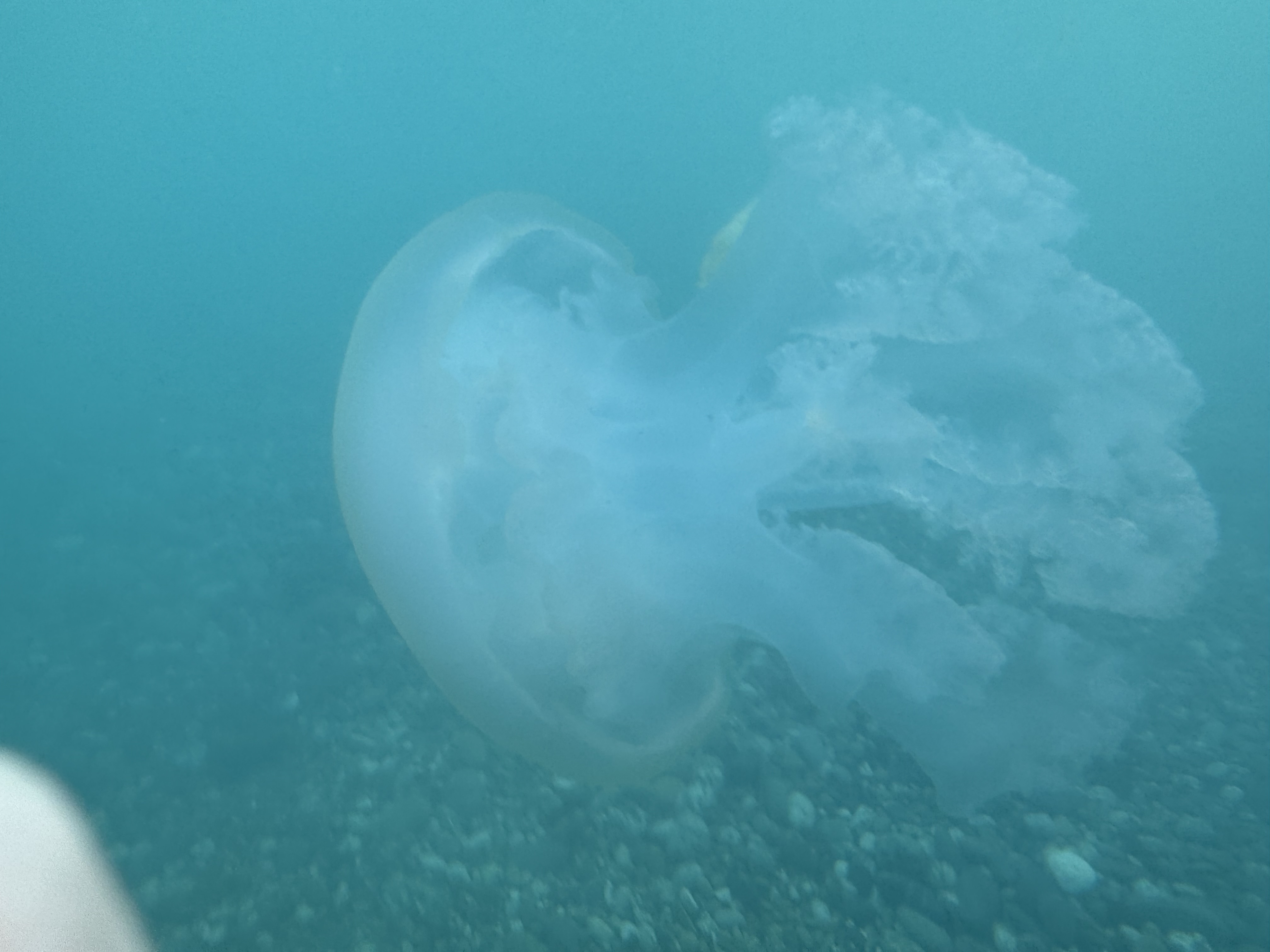 Saw tons and tons of these guys while swimming in monterosso. Saw a life guard pick one up with his bare hands and put it in a bucket. Maybe it was dead. There was another further out probably the size of a large watermelon that looked like this guy, but had like a blue or purple ring around its cap.