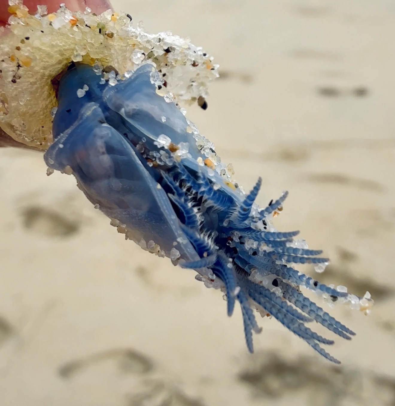 There were hundreds of Velella Velella all over the beach this morning and dozens of them had this creature attached to the bottom of the raft part. It almost looks like a butterfly pupae? Is this part of the Velella or something else altogether?