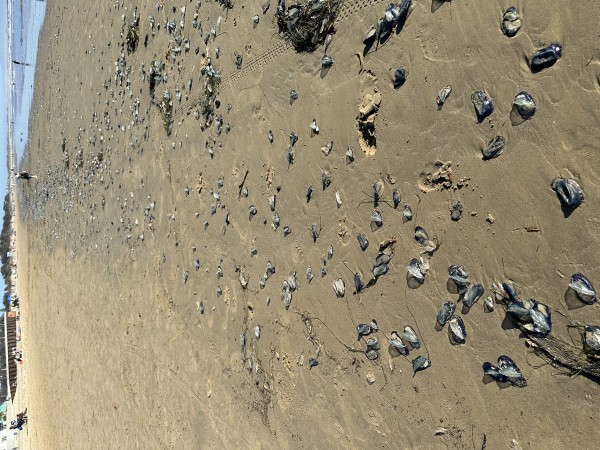 Thousands of blue velellas on Rosie’s dog beach in Long B