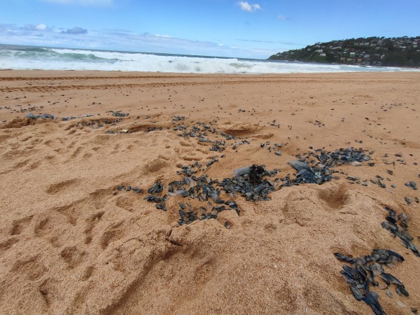 About 5-10 jellyfish along the shore of the Yorktown Beac