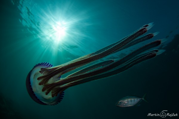 Thysanostoma sp. accompanied by a juvenile trevally.