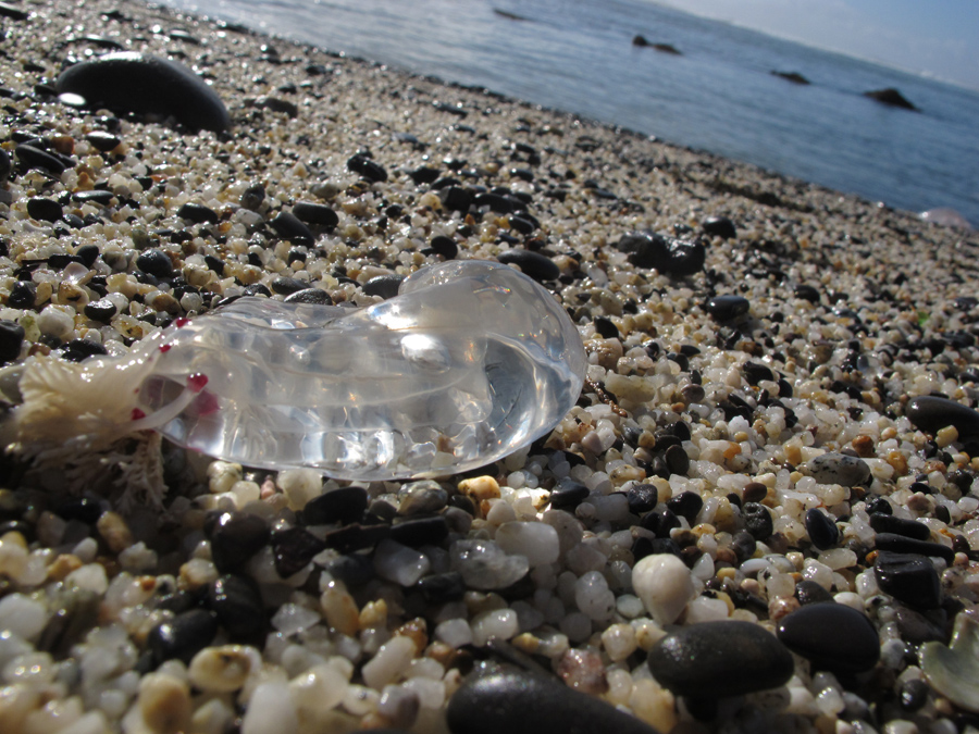 Lots of clear jellyfish beached on the sand at low tide.<