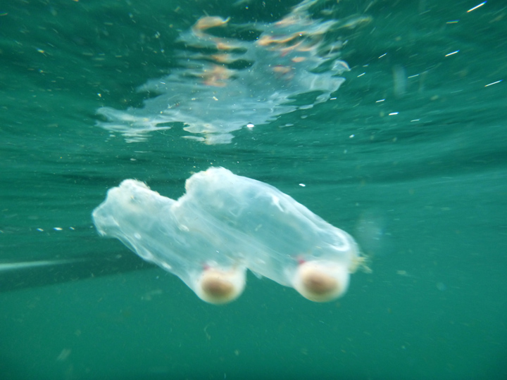 One dying moon jelly in an eddy line, 2 harbor porpoise,